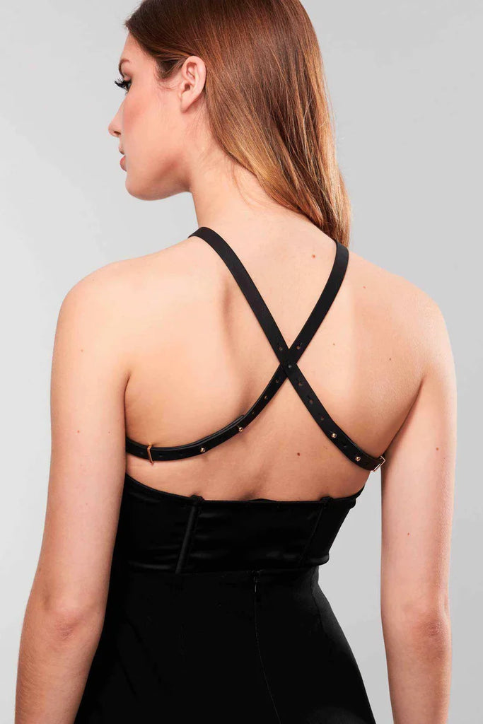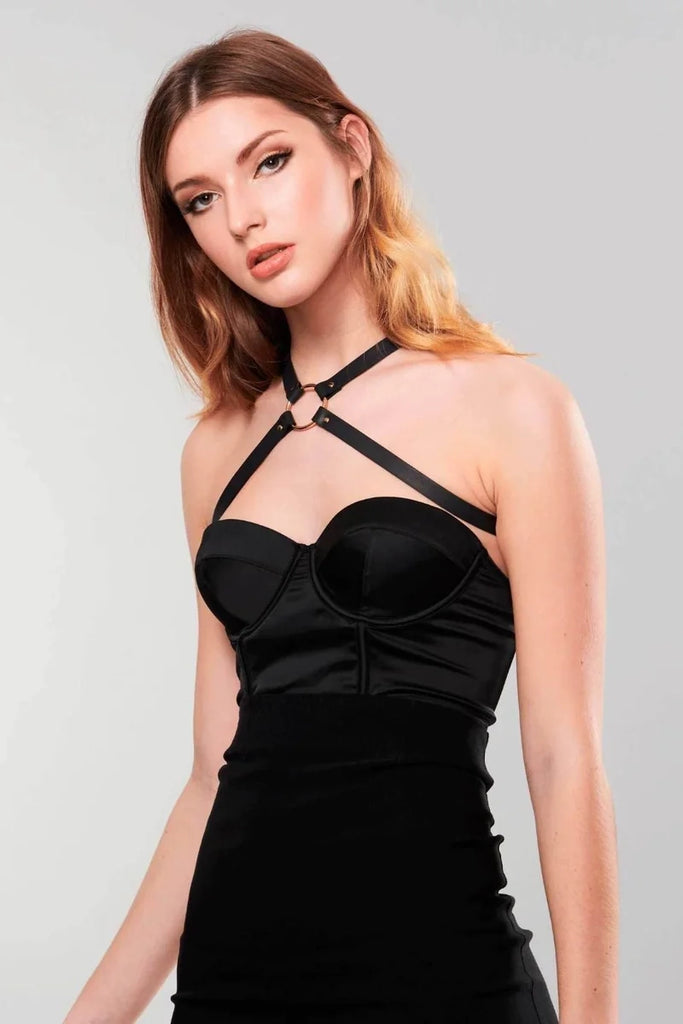 This harness is made to impress. Whether you wear it over your clothes as a statement piece or under your clothes to make you feel sexy all day long, the MAZE Cross Chest Harness highlights your assets. With its center metal ring directly in the middle of your chest, it brings attention not only to your breasts, but makes anyone who’s looking at you, shift their eyes slightly upward to your suprasternal notch — that sexy visible dip at the base of the neck between the clavicle bones. The suprasternal notch is an erogenous zone that’s often overlooked, despite being regarded as one of the sexiest spots on a human.
