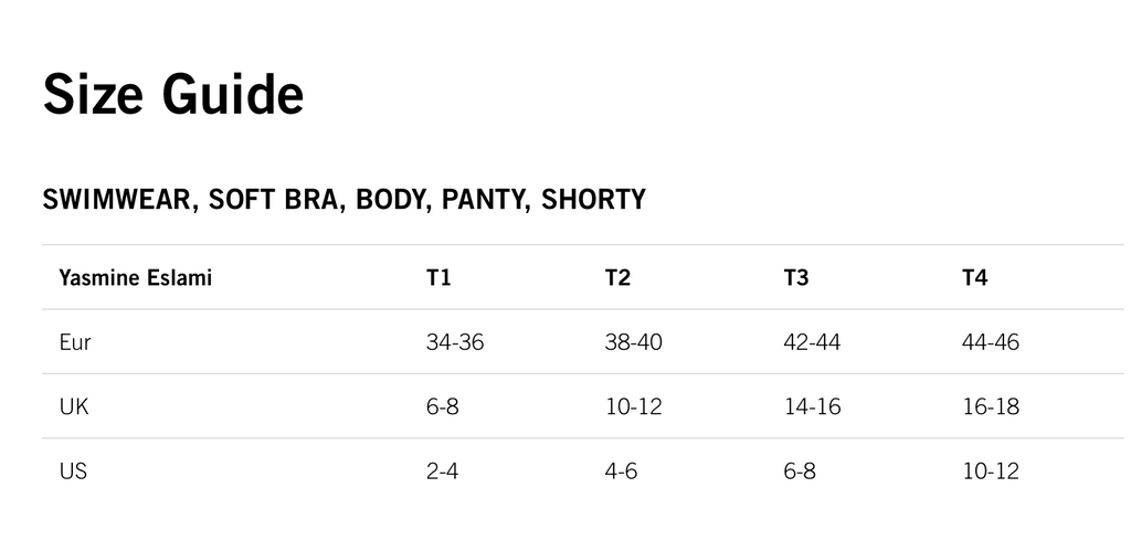 | Yasmine Eslami | T1/S | T2/M | T3/L-XL | |