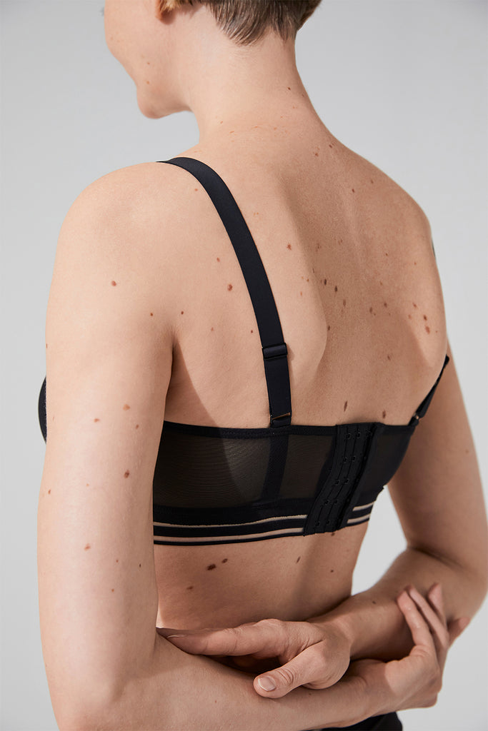 Joy is our first full support wireless bra for sizes up to F cup. Made with reinforced sections and a lifting seam construction this modern long-line bra performs with smart structure and wireless comfort. Designed for daily wear and free movement. Joy is a design play between opaque and sheer.