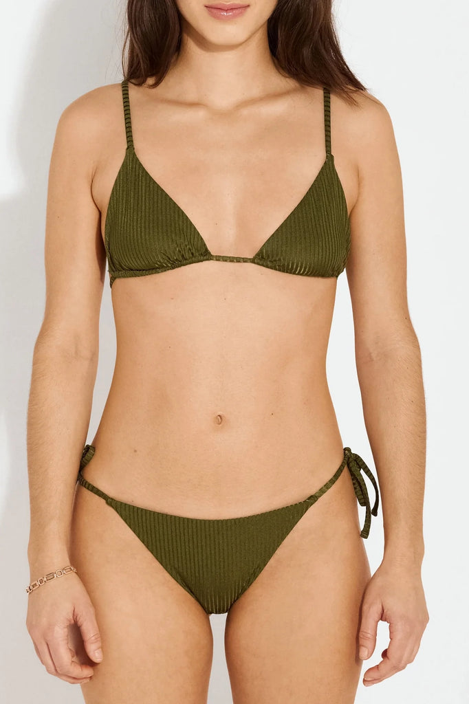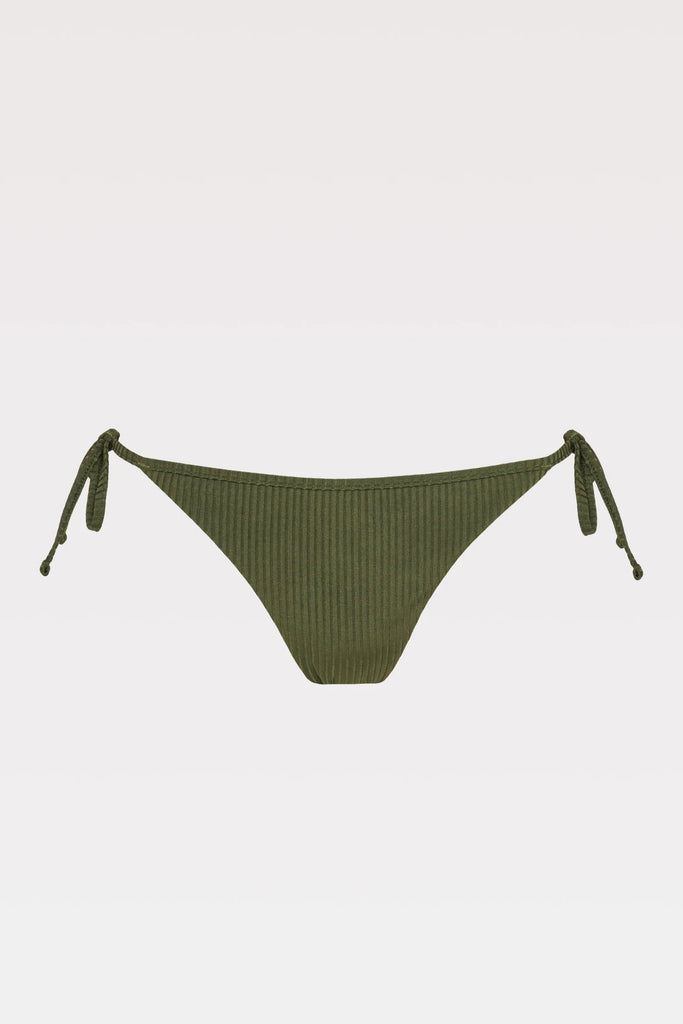 Der minimalistische Bikini, ein wenig ausgeschnitten (wie ein Bikini sein sollte), aber nicht zu weit. Du kannst selbst entscheiden, wie viel Ausschnitt und Sexyness Du dir wünschst, indem du die Bänder mehr oder weniger hoch auf den Hüften bindest. Das dünne, gerippte Material ist super angenehm und das leuchtende Khaki ist sehr elegant.