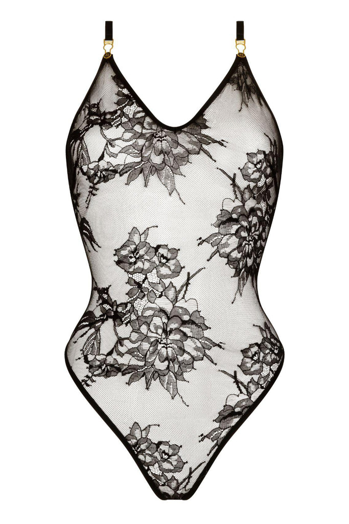 Tief ausgeschnittener Body aus Spitze mit großem Blumenmuster.