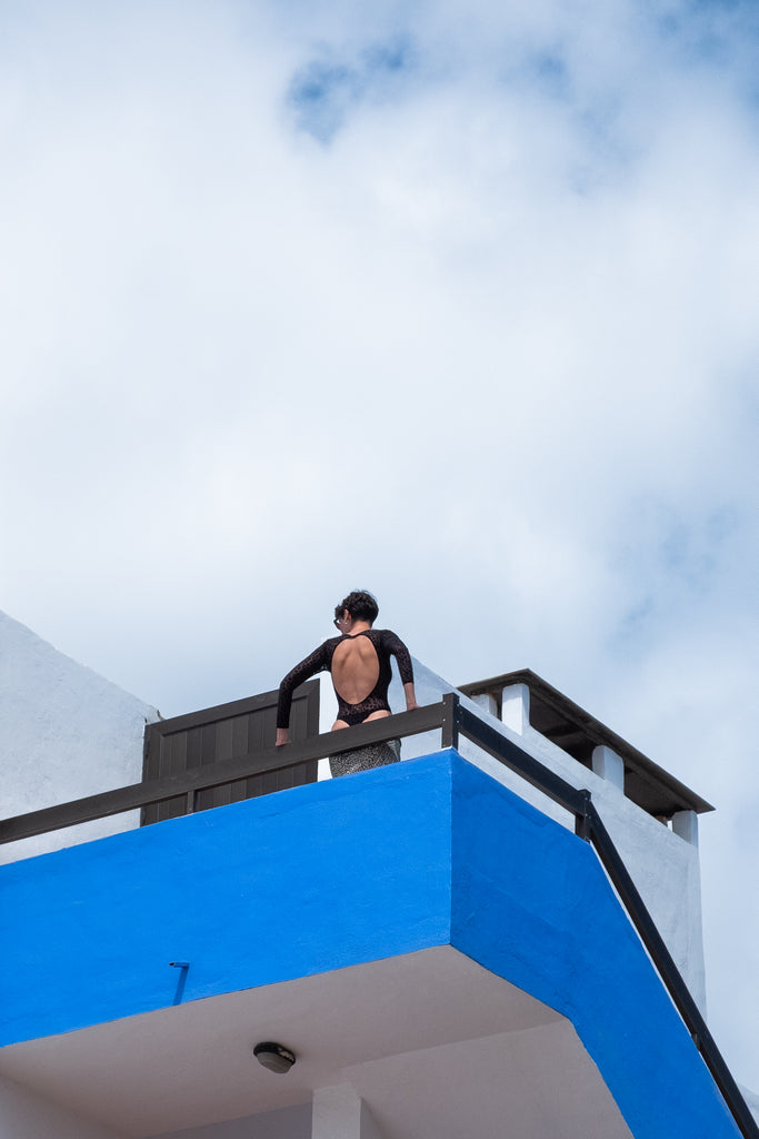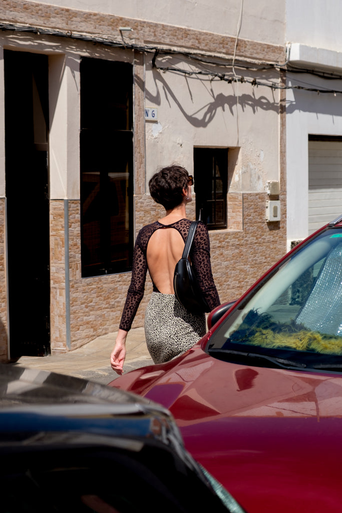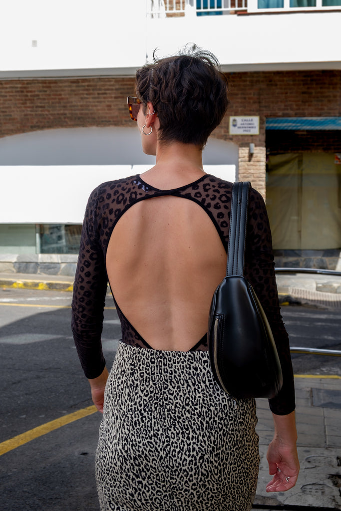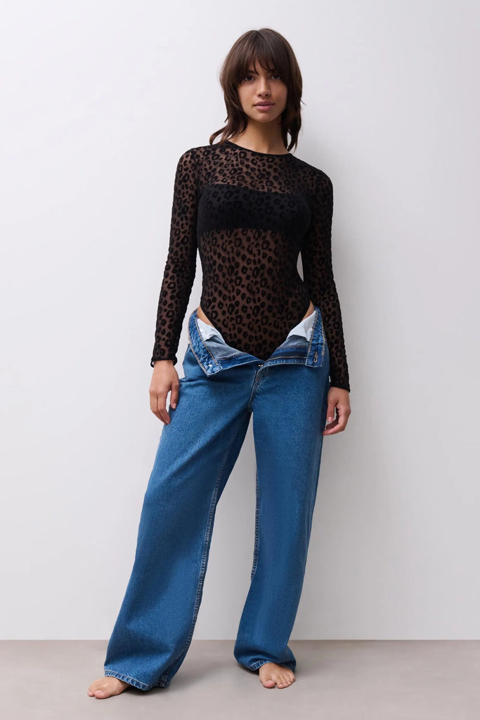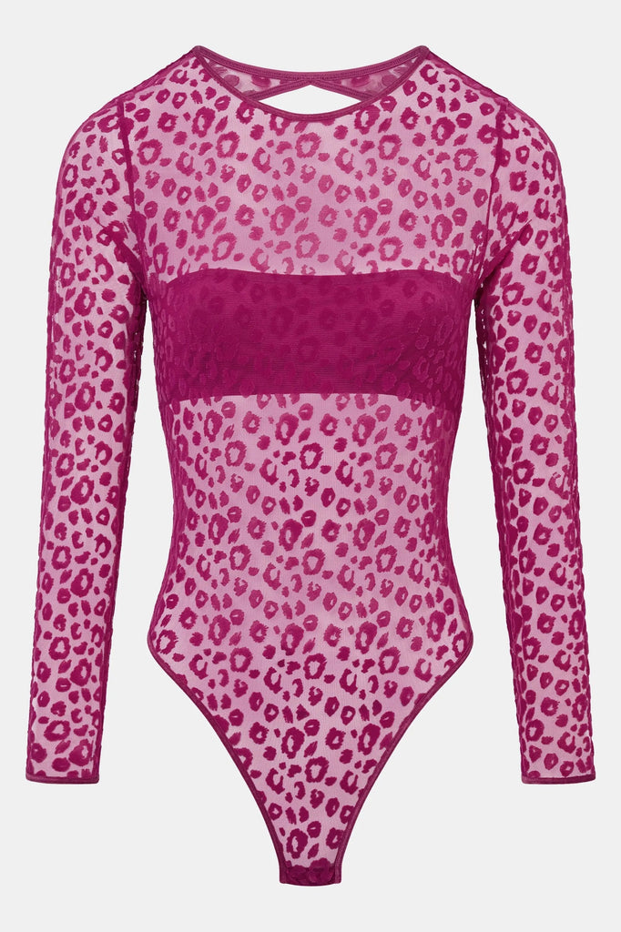 Ein schmal geschnittener Body mit langen Ärmeln und Druckknöpfen, der einen samtigen Panther-Print, einen Wasserfallausschnitt am Rücken und ein integriertes Bustier für den Alltag bietet.