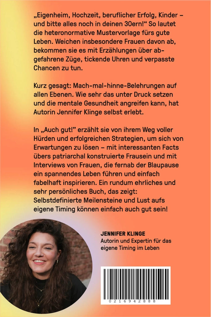 Wie sehr das unter Druck setzen und die mentale Gesundheit angreifen kann, hat Autorin Jennifer Klinge selbst erlebt. In „Auch gut!” erzählt sie von ihrem Weg voller Hürden und erfolgreichen Strategien, um sich von Erwartungen zu lösen – mit interessanten Facts übers patriarchal konstruierte Frausein und mit Interviews von Frauen, die fernab der Blaupause ein spannendes Leben führen und einfach fabelhaft inspirieren.