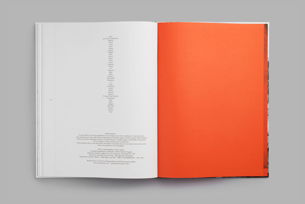 In Romys kleinem Pariser Zimmer posieren Freund*innen, lesbische und queere Aktivist*innen sowie Sexarbeiter*innen. Mit Humor und Selbstironie als Protestmittel webt sie eine subjektive Geschichte der sogenannten dissidentischen Sexualitäten. Gegenüber dem unendlich Intimen entfaltet sich das unendlich Große: Geröllhalden, Wasserfälle und Gipfel, die alle vom Eros gefärbt sind. In diesem Buch werden drei zwischen 2019 und 2025 entstandene Serien vereint und einander gegenübergestellt: Selbstporträts (Things I imagined), intime Porträts (Just Us) und Berglandschaften (Vertige). Sie werden von drei Kurzgeschichten begleitet, die von Romy Alizée geschrieben wurden und die Themen Arbeit, soziale Klasse und Freund*innenschaft erforschen. Durch eine sehr mündliche Schreibweise werfen sie ein zärtliches und komisches Licht auf ihren Werdegang als Künstlerin.