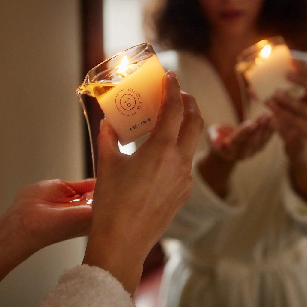 Zünde den Docht an und lass das Öl in einer gleichmäßigen Schicht schmelzen (ca. 20 Minuten). Lösch die Flamme. Gieß das Öl direkt auf die Haut oder nimm es mit den Fingerspitzen auf. Massiere es in die Haut ein, um ein gepflegtes und geschmeidiges Hautgefühl zu erhalten.