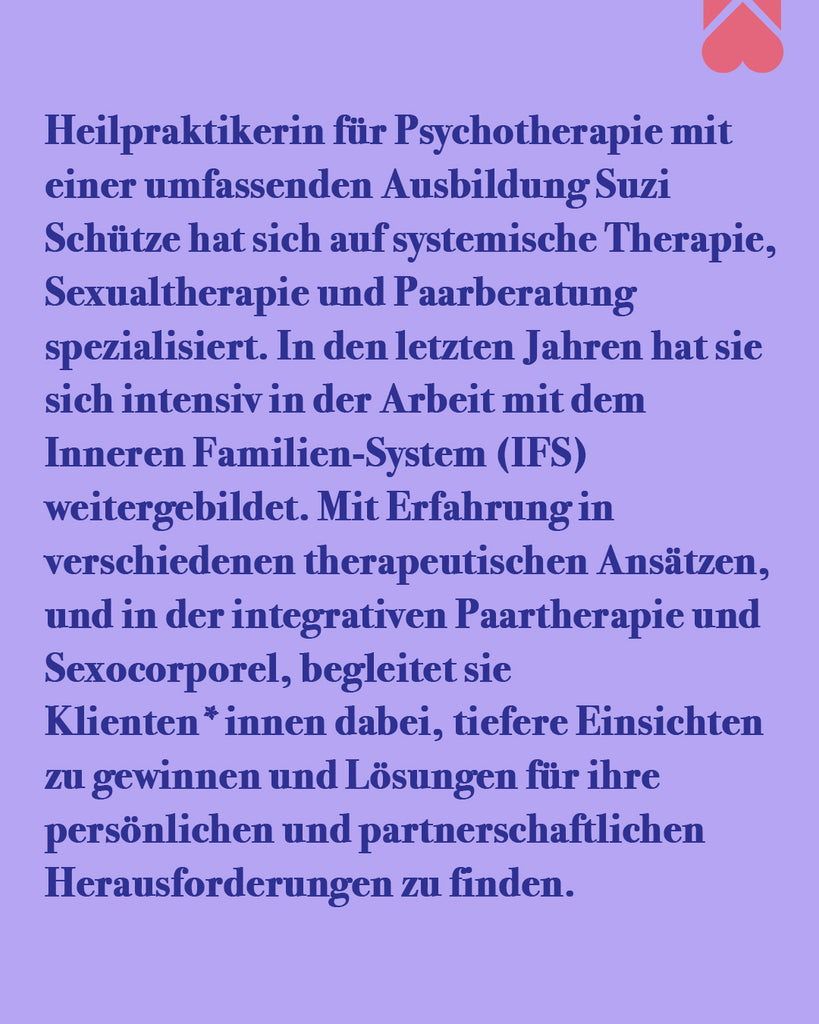 Heilpraktikerin für Psychotherapie mit einer umfassenden Ausbildung Suzi Schütze hat sich auf systemische Therapie, Sexualtherapie und Paarberatung spezialisiert. In den letzten Jahren hat sie sich intensiv in der Arbeit mit dem Inneren Familien-System (IFS) weitergebildet. Mit Erfahrung in verschiedenen therapeutischen Ansätzen, und in der integrativen Paartherapie und Sexocorporel, begleitet sie Klienten*innen dabei, tiefere Einsichten zu gewinnen und Lösungen für ihre persönlichen und partnerschaftlichen Herausforderungen zu finden.