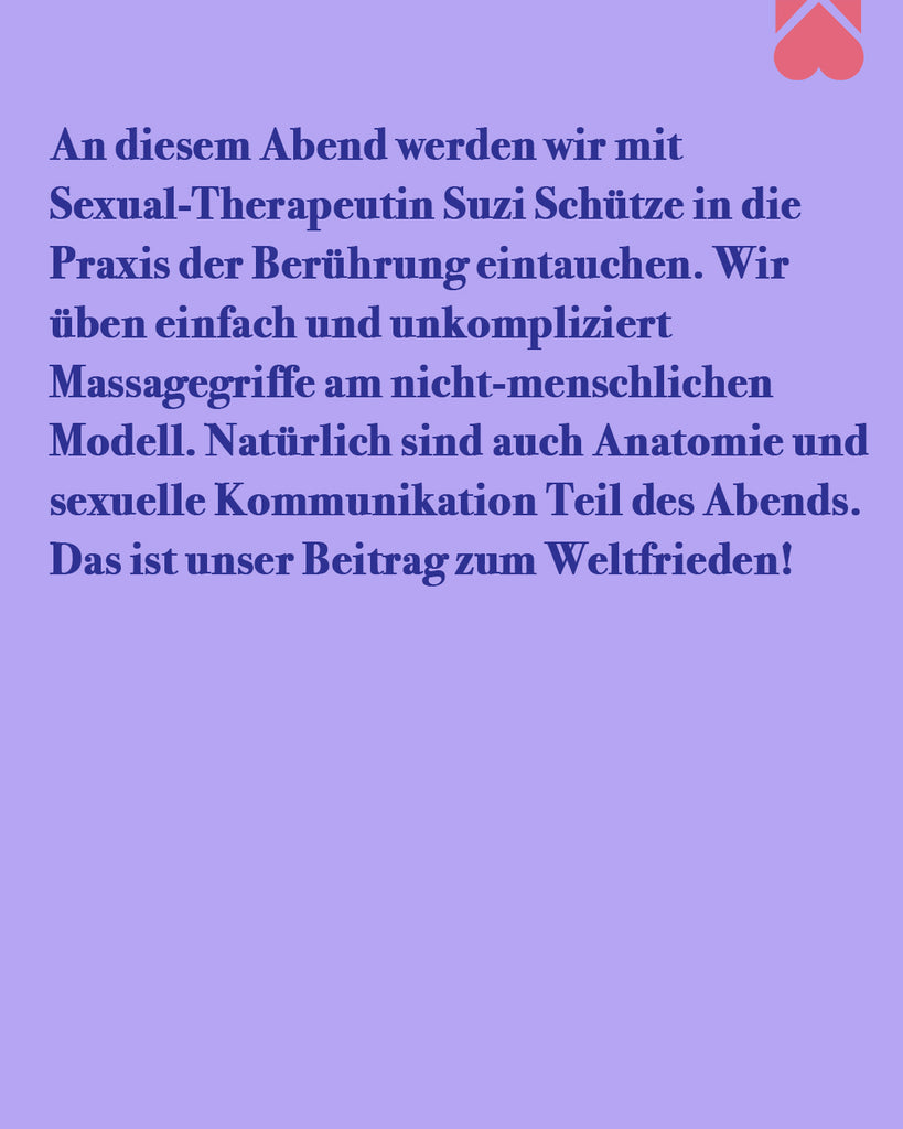 An diesem Abend werden wir mit Sexual-Therapeutin Suzi Schütze in die Praxis der Berührung eintauchen. Wir üben einfach und unkompliziert Massagegriffe am nicht-menschlichen Modell. Natürlich sind auch Anatomie und sexuelle Kommunikation Teil des Abends. Das ist unser Beitrag zum Weltfrieden!