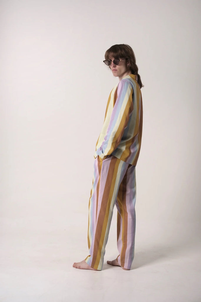 Dieser Unisex-Pyjama aus garngefärbter Bio-Baumwolle sieht an Männern und Frauen gleichermaßen gut aus. Er hat eine bequeme Passform, einen kurzen Kragen, zwei Außentaschen an der Jacke und zwei Seitentaschen an der Hose, was für ein Luxus!