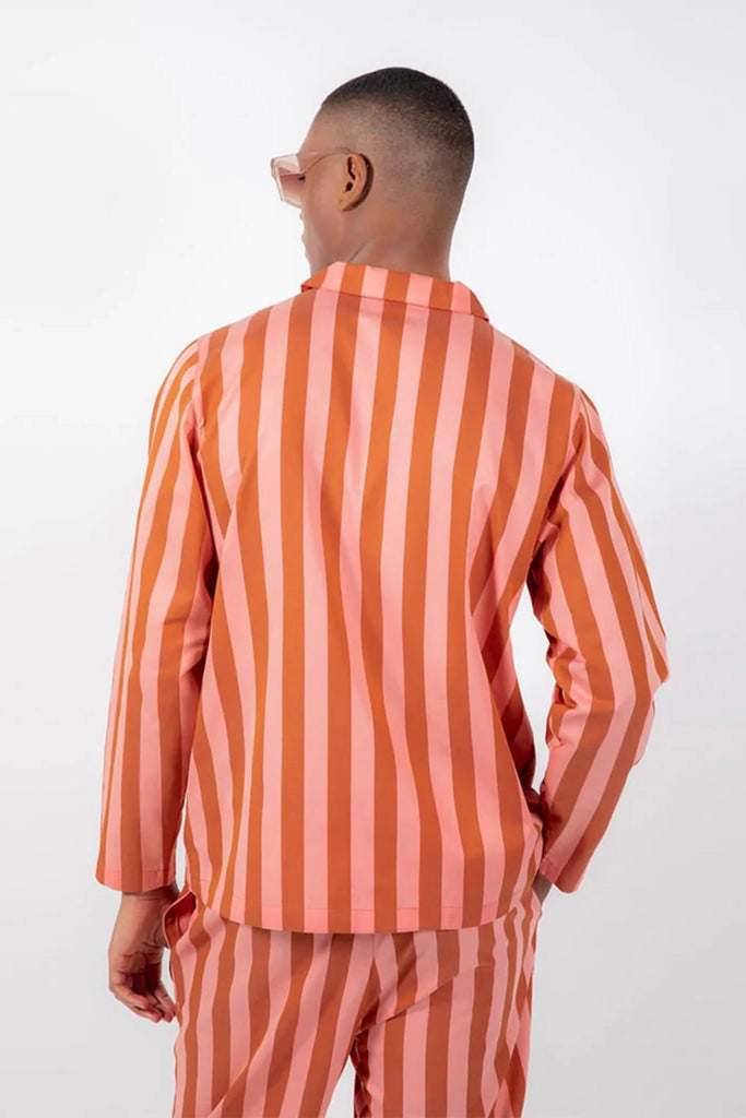 Dieser Unisex-Pyjama aus garngefärbter Bio-Baumwolle sieht an Männern und Frauen gleichermaßen gut aus. Er hat eine bequeme Passform, einen kurzen Kragen, zwei Außentaschen an der Jacke und zwei Seitentaschen an der Hose, was für ein Luxus!
