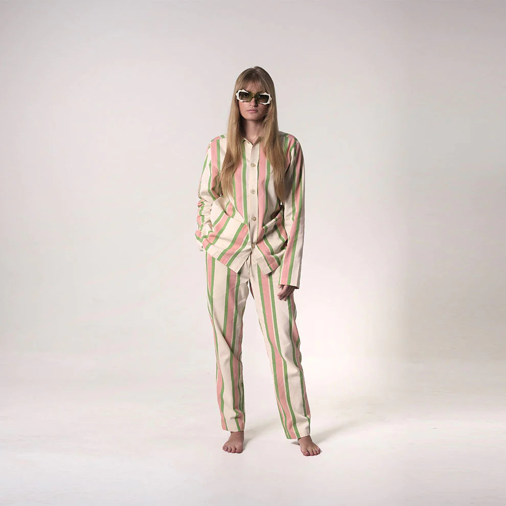 Dieser Unisex-Pyjama aus garngefärbter Bio-Baumwolle sieht an Männern und Frauen gleichermaßen gut aus. Er hat eine bequeme Passform, einen kurzen Kragen, zwei Außentaschen an der Jacke und zwei Seitentaschen an der Hose, was für ein Luxus!