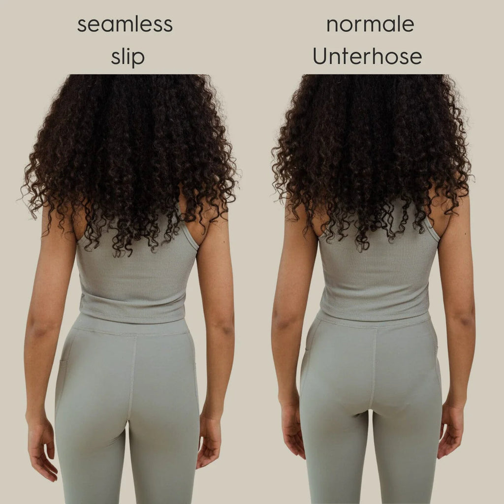 Trommelwirbel: Kora Mikino hat einen Seamless Slip entwickelt der wirklich ohne Nähte oder geklebte Kanten am Bein und Po auskommt und auch unter der engsten Leggings KEINEN Abdruck hinterlässt und unsichtbar ist.