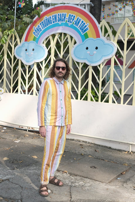 Dieser Unisex-Pyjama aus garngefärbter Bio-Baumwolle sieht an Männern und Frauen gleichermaßen gut aus. Er hat eine bequeme Passform, einen kurzen Kragen, zwei Außentaschen an der Jacke und zwei Seitentaschen an der Hose, was für ein Luxus!