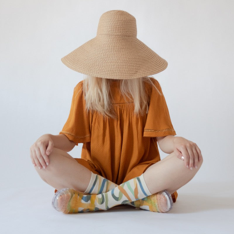 Lichen Green, Wilted Yellow, Ocre Brown and Paradise Blue Ribbon on Natural background with Adobe Orange toe.