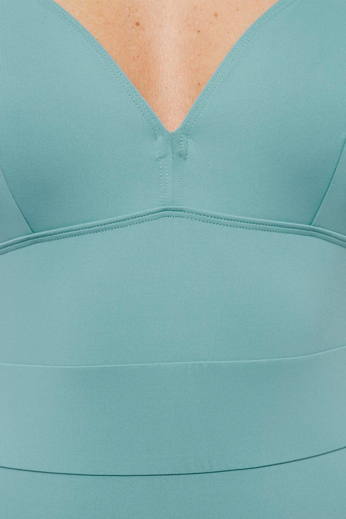 Badeanzug mit V-Ausschnitt für tiefe Körbchen. Versteckter Bügel und breite Träger für eine gute Brustunterstützung. Verstellbare Träger hinten.