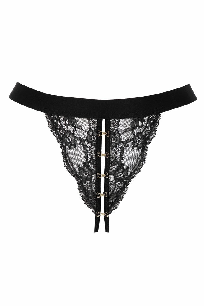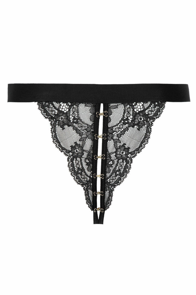 Offener Mini-Slip mit grafischem Bund und zarter Spitze, der sich von vorne bis hinten vollständig öffnen lässt und mit kleinen goldenen Häkchen versehen ist.
