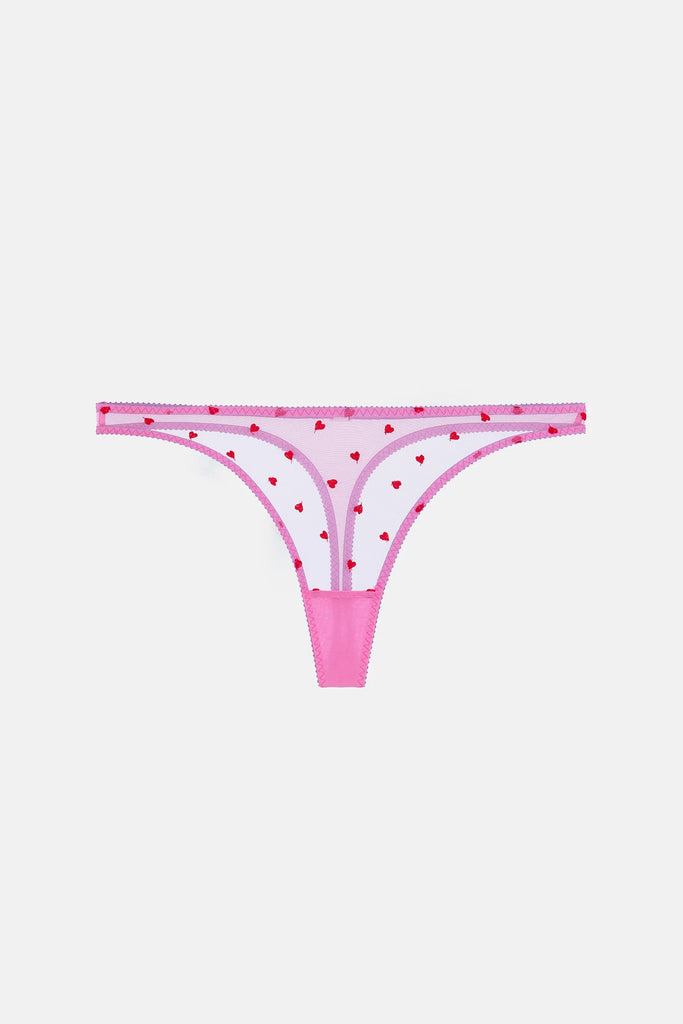 Der Tanga ist aus weichem, transparentem Tüll mit einer maßgeschneiderten Herzstickerei gefertigt und verleiht jedem Tag das gewisse Etwas.