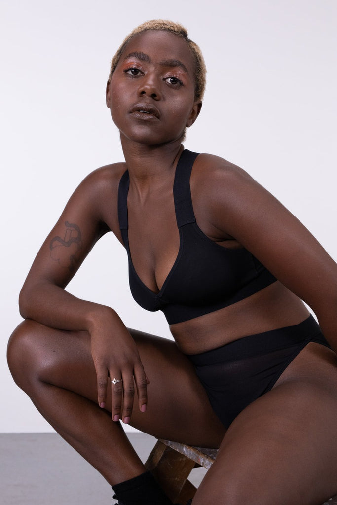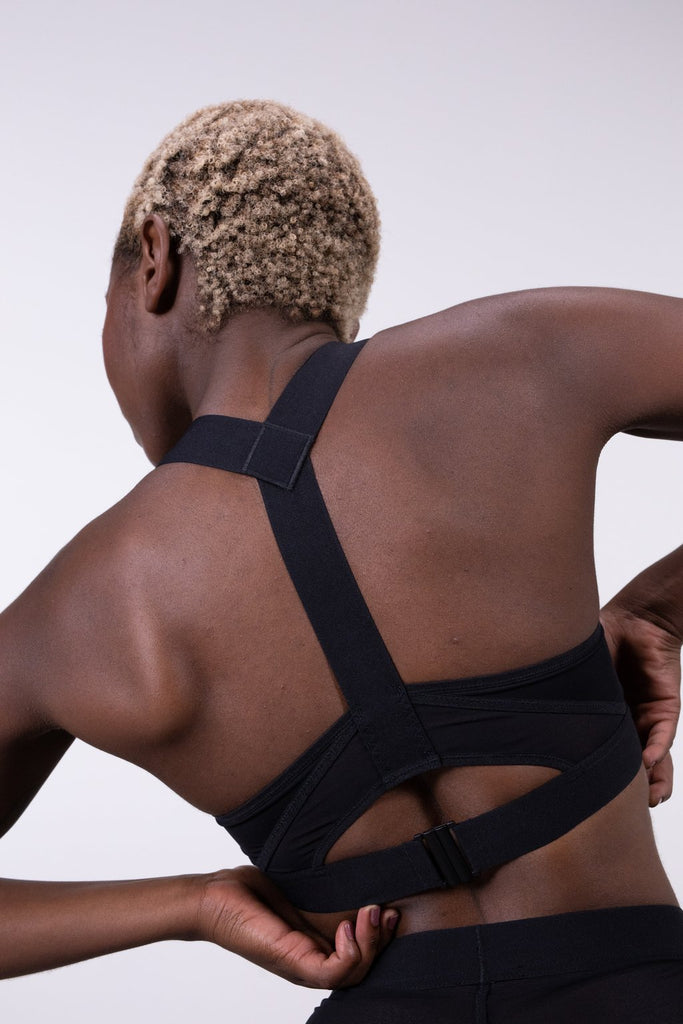 non padded underwire-free black cups separated by a transparent triangle mid front, wide shoulder straps for luxurious support, an open back for generous movement, wide contour strap under the chest replacing our mental need for underwire.