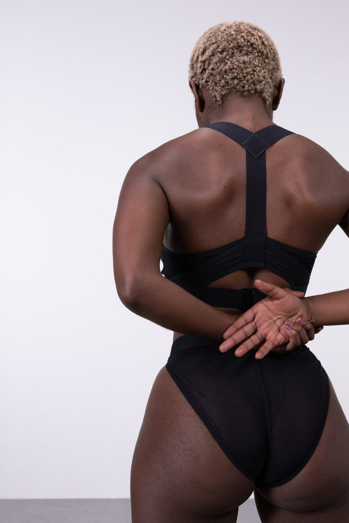 black Y-shaped shoulder straps plunging head first into a transparent section slashing the black back panel. separate elastic contour strap with black clasp, because we love some added drama when it comes to clothes. designed as swimwear and lingerie.
